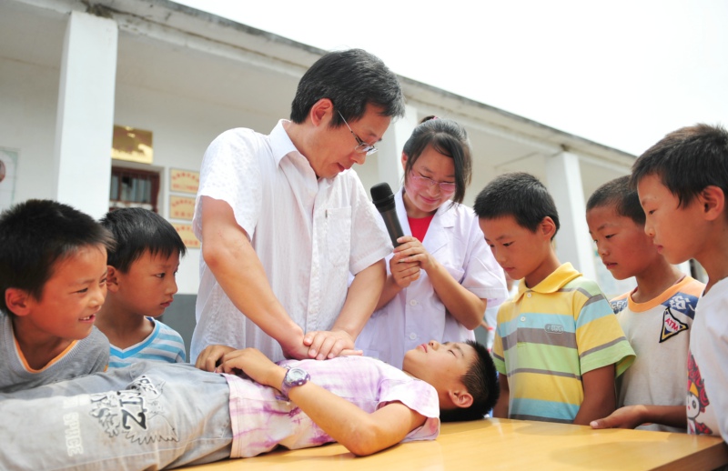 本次活動分為三個部分,即文藝演出,豐富和活躍基層群眾的業余文化生活;關愛留守兒童,贈送學習用品和圖書,并為他們拍攝相片,以彩信的方式發送給他們遠在異地打工的父母;關愛留守老人,幫助村民測量血壓,進行血型鑒定,并宣傳基本的醫療衛生知識。指導教師杜江還就夏天易發生兒童溺水現象向村民們現場演示如何施救溺水兒童。