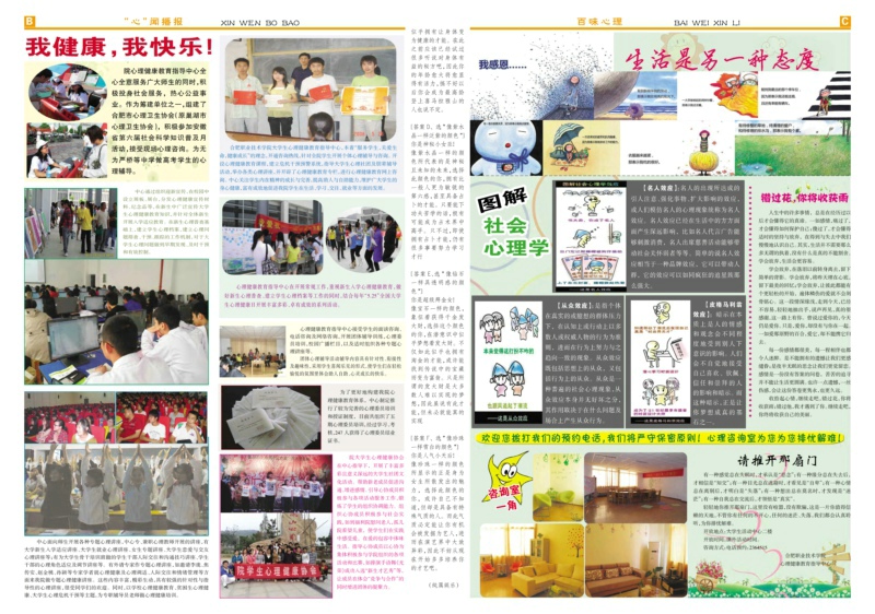 “心語(yǔ)”5.25專刊為同學(xué)們呈現(xiàn)了“‘心’聞播報(bào)”、“百味心理”、“心海拾貝”等版塊,內(nèi)容設(shè)計(jì)豐富多彩、生動(dòng)活潑,采取學(xué)生喜聞樂(lè)見(jiàn)、圖文并茂的形式,既宣傳了學(xué)院心理健康教育工作,又普及了心理健康方面的知識(shí)。“心語(yǔ)”的問(wèn)世,為我院心理健康教育搭建了又一平臺(tái)。