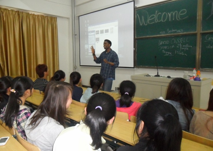 David語言風(fēng)趣幽默,詼諧生動(dòng),為同學(xué)們介紹了牙買加的學(xué)習(xí)環(huán)境與生活習(xí)慣,引起了學(xué)生們的極大興趣。David還模仿了電視廣告里的英語片段,場(chǎng)下掌聲不斷,學(xué)生反響熱烈。同學(xué)們還就關(guān)心的問題和David用英語進(jìn)行交流。David不僅認(rèn)真回答了同學(xué)的問題,還對(duì)他們的的英語表達(dá)能力給予充分的肯定,并進(jìn)行現(xiàn)場(chǎng)指導(dǎo)。