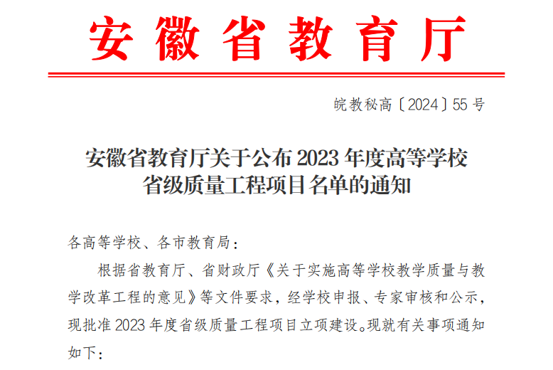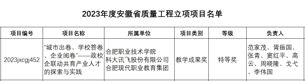 2024年6月,安徽省教育廳公布了2023年高等學校省級質量工程項目名單,我校與科大訊飛股份有限公司、合肥現代職業教育集團等單位聯合申報的《“城市出卷、學校答卷、企業閱卷”——政校企聯動共育產業人才的探索與實踐》榮獲特等獎。安徽省教學成果獎每兩年評選一次,旨在獎勵在教學實踐、改革、研究中取得顯著成果的單位和個人,發揮教學成果的引領示范作用。特等獎是安徽省教育教學領域的最高獎項,也是反映該校辦學綜合實力的重要體現。我校將進一步加大教學成果的培育力度和示范推廣,提前謀劃國家教學成果獎的組織與申報工作。