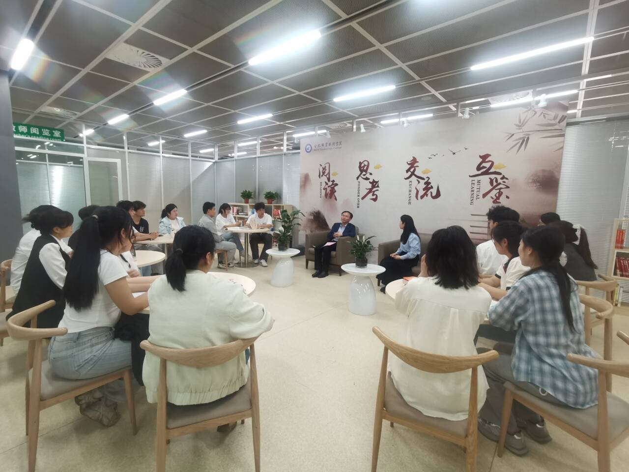 4月23日世界讀書日當天,我校在匯心湖校區圖書館四樓教師研修室舉辦了主題為“書香潤心田 對話啟未來”的校長讀書分享會。校黨委副書記、校長檀明和教師、學生代表齊聚一堂,通過多元互動共話閱讀力量,深化校園文化內涵。校黨委副書記金飛燕參加。