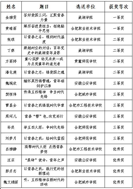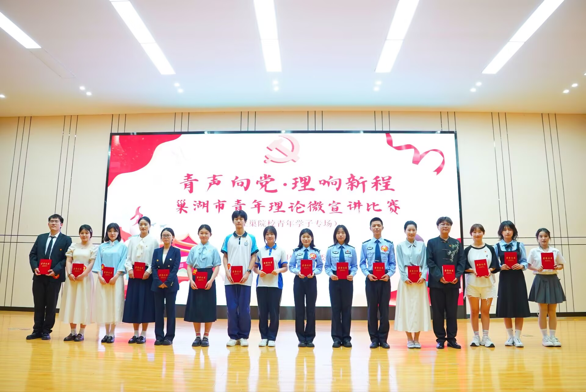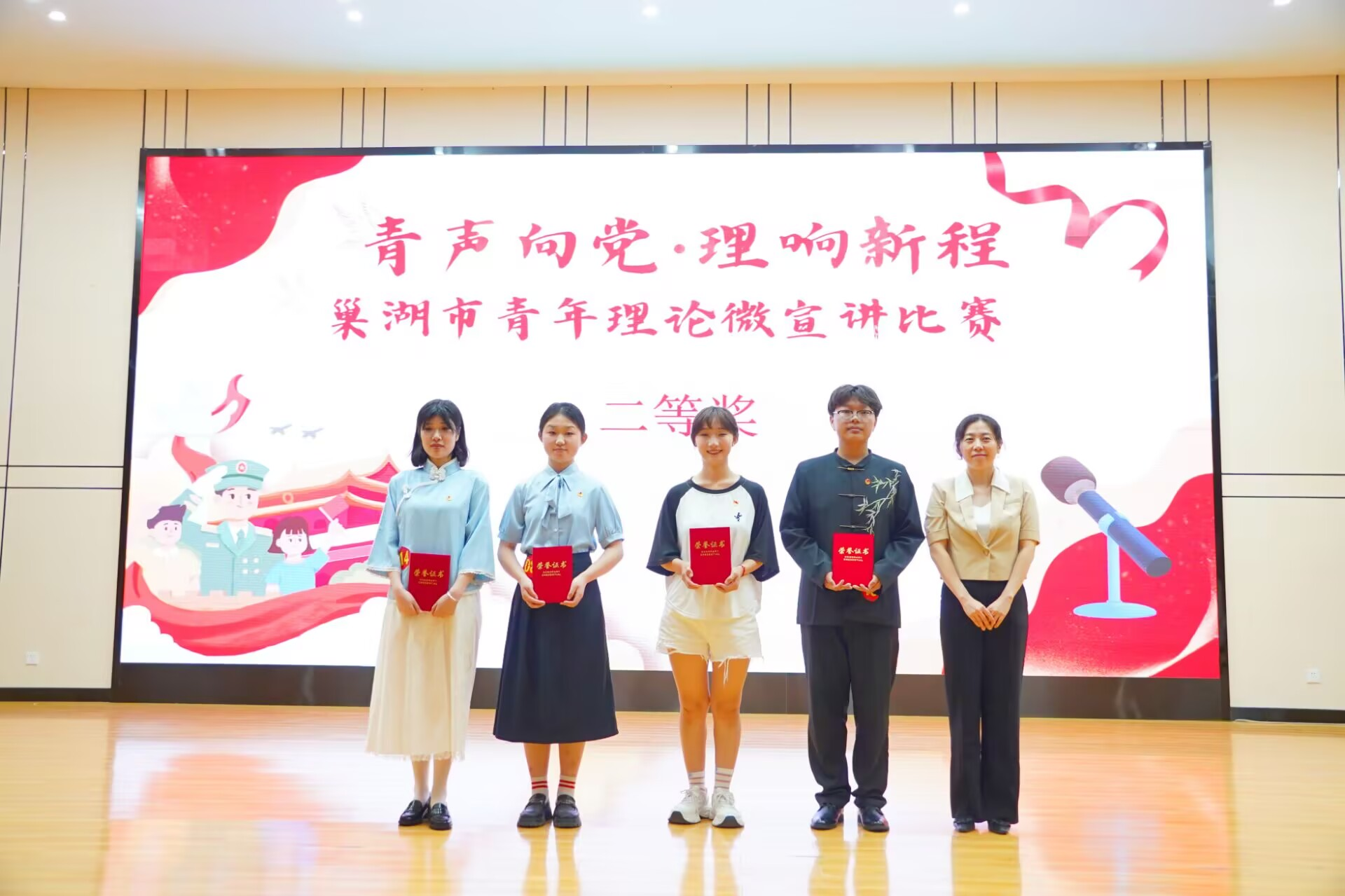 5月21日,由團巢湖市委組織開展的“青聲向黨 理響新程”巢湖市青年理論微宣講比賽(駐巢院校青年學子專場)在合肥城市學院濱湖校區拉開帷幕,我校黃晴雨、張琪、郭貞志三名選手代表學校參賽。