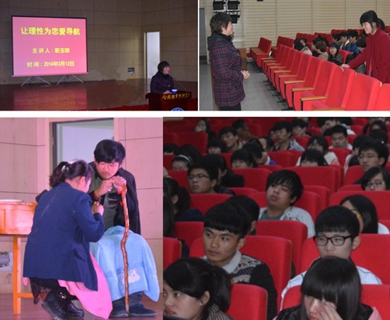 啞劇“同桌的你”引出了本次講座的主題——愛情。演員出色的演技,動人的音樂,搞笑的情節一下子吸引了觀眾們的注意力。靳玉瓊老師從在校大學生的愛情入題,和同學們進行互動,告訴同學們如何樹立正確的戀愛觀,如何全面、正確、理性地對待戀愛行為和戀愛中出現的問題,特別提醒同學們:愛情不能盲從和沖動。靳老師親切幽默的講話風格,豐富深刻的事例剖析,給在場同學留下深刻的印象。“珍愛你的青春,就是珍愛你的未來;愿大家擁有碧綠的情感之舟,擁有美好的未來!”在靳老師的祝福和同學們熱烈的掌聲中,講座圓滿結束。