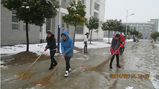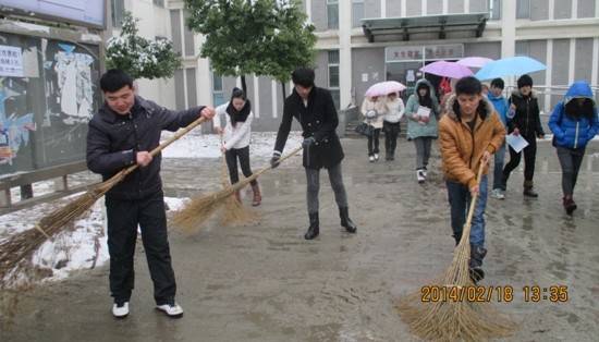 凜冽的寒風,零下的低溫,厚厚的積雪,簡易的工具,面對困難,絲毫沒有影響學生會干部們掃雪的熱情。他們拿起掃帚、鐵鍬,鏟的鏟,推的推,掃的掃,場面熱火朝天,歡聲笑語。他們用自身的行動與身影感染、感動著過往的同學。經過奮戰,宿舍區與一食堂之間的道路被清理得干干凈凈,為廣大師生掃出了一條洋溢著溫情的方便之路。