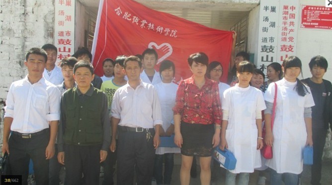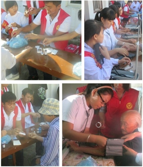 由醫學相關類專業的志愿者們組成的義診隊為村里的老人們測量血壓、血糖,檢測血型,并為他們制作了健康檔案,同時向他們宣傳老年人保健知識。
