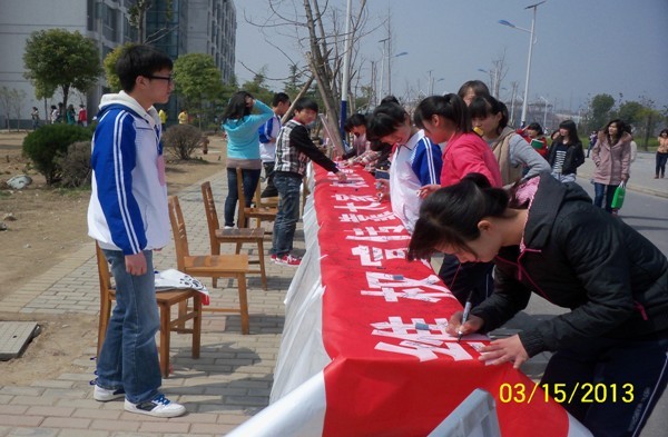 院學生會成員在放學高峰時段利用“歪歪”交流聊天軟件平臺熱情的向路過的師生介紹此次活動,宣傳消費維權知識,并邀請他們在條幅上簽名。活動受到了師生的積極響應,現場氣氛十分熱烈。