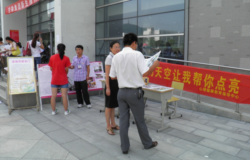 中心通過在校園設展臺、展板,積極宣傳心理健康教育的理念與知識;向同學們分發中心印制的宣傳書簽、《心語》心理報等宣傳材料,為新生提供解決心理問題的新途徑;同時通過現場的介紹、答疑服務,為新生盡快適應學校環境,提供了一條捷徑。