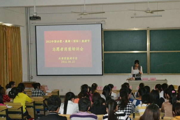 4月25日下午,我院100位青年志愿者參加了在教學樓A幢階梯教室舉辦的中國合肥•巢湖(國際)旅游節志愿者崗前培訓會。