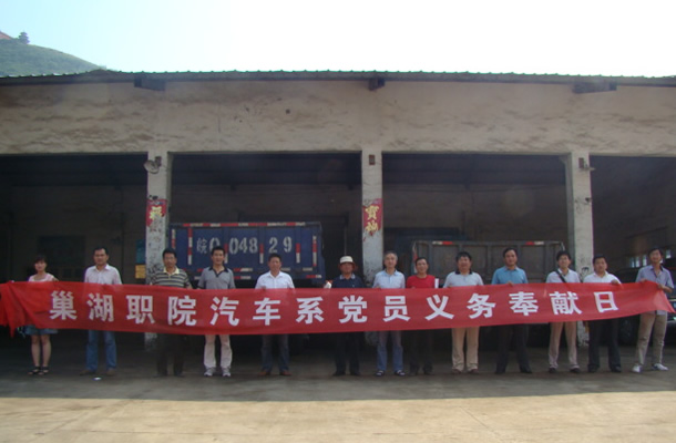 為夯實創先爭優活動成果,根據學院黨委的部署和要求,汽車系黨總支結合本系的實際情況,發揮自身專業優勢,6月1日系黨總支書記汪春榮、王里平副書記、系教工支部程師蘇書記、學生支部伍東升書記帶領系教工支部、學生支部全體黨員到巢湖市東亞汽車修理廠開展義務奉獻活動。
