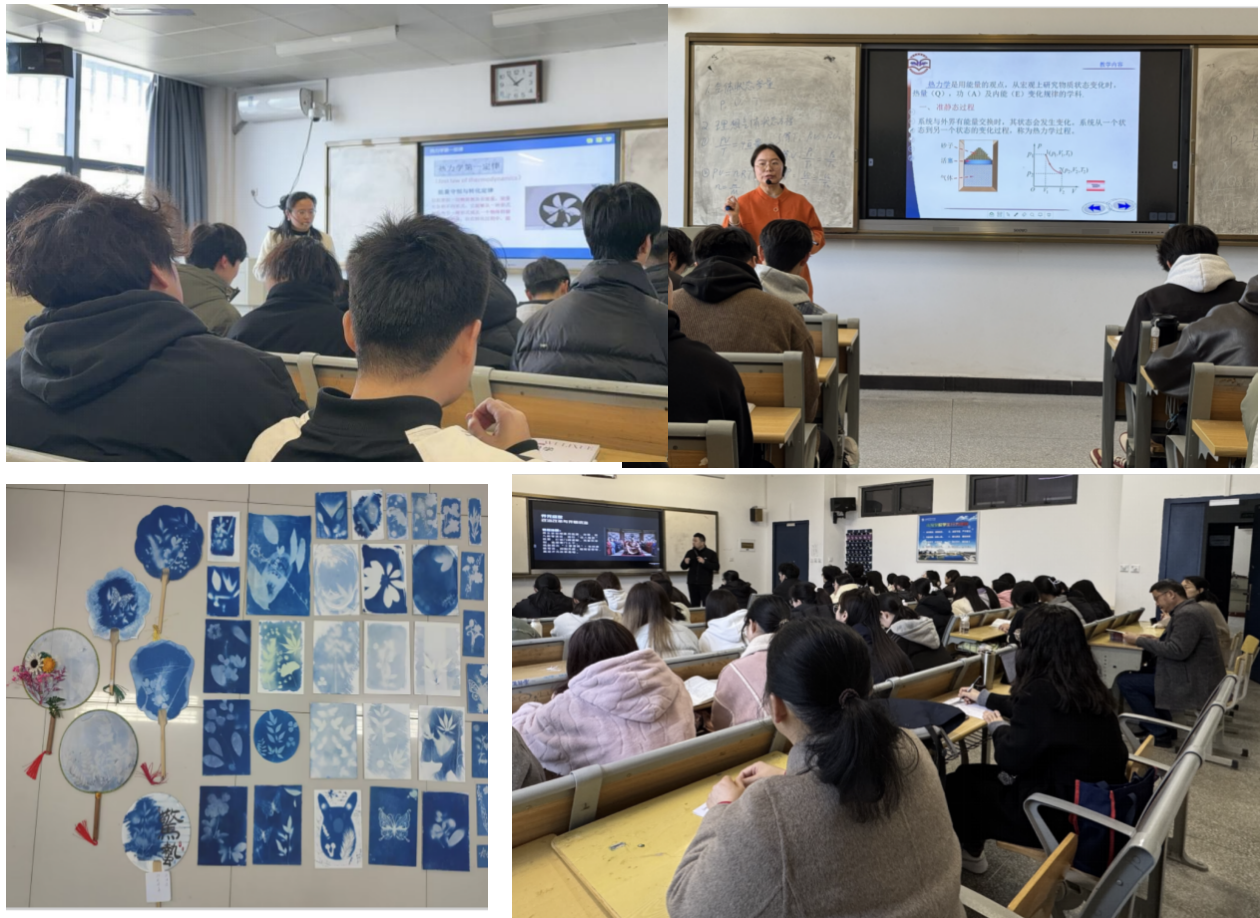 何楊老師《大學美育》以“藍曬實踐”激活美育課堂,引導學生采集自然素材創作藍曬作品,在光影化學中感悟自然之美與匠心之趣;張鵬老師《中華優秀傳統文化》帶師生“穿越盛唐”,以社會風貌為經緯、詩人軼事為紐帶,生動解構唐詩的歷史華章與文化神韻;儲開念、邱茂琴博士的《物理學》課堂分別聚焦熱力學平衡與理想氣體定律,將抽象原理融入生活案例,通過啟發式教學深化專業認知。課后深度評課交流,實現了專兼職教師教學理念的碰撞融合。