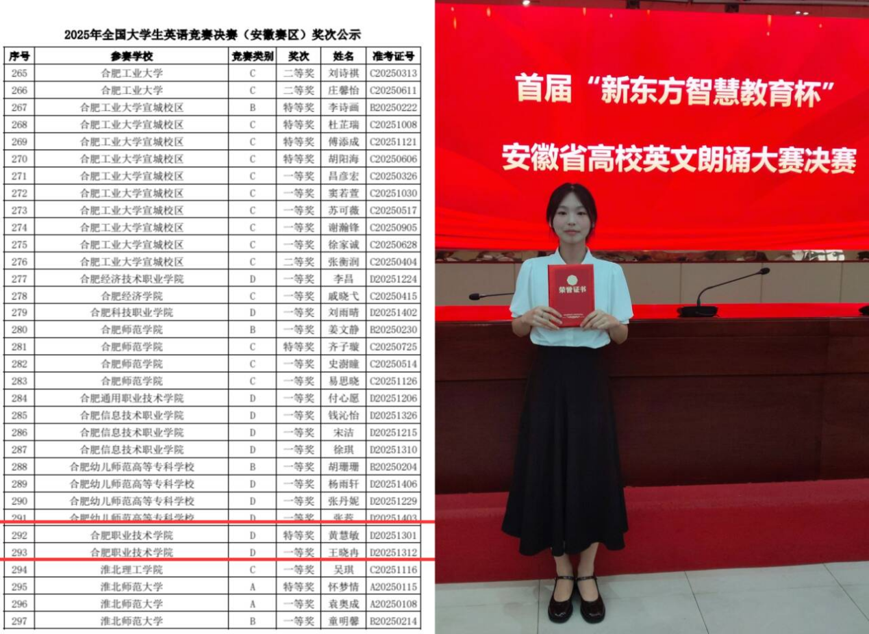 近期,我校學子在省級英語競賽中捷報頻傳。5月10日,在2025年度全國大學生英語競賽(安徽賽區)決賽中,基礎教育學院選派黨員教師尹悅、楊凌擔任指導教師,全程跟蹤指導。經過激烈角逐,尹悅老師指導的經貿旅游學院黃慧敏同學榮獲最高獎項“特等獎”,楊凌老師指導的醫學院王曉冉同學斬獲“一等獎”。尤為可喜的是,這是我校繼2021年、2024年后,第三次摘得該賽項省賽特等獎桂冠,書寫了新的驕傲篇章。