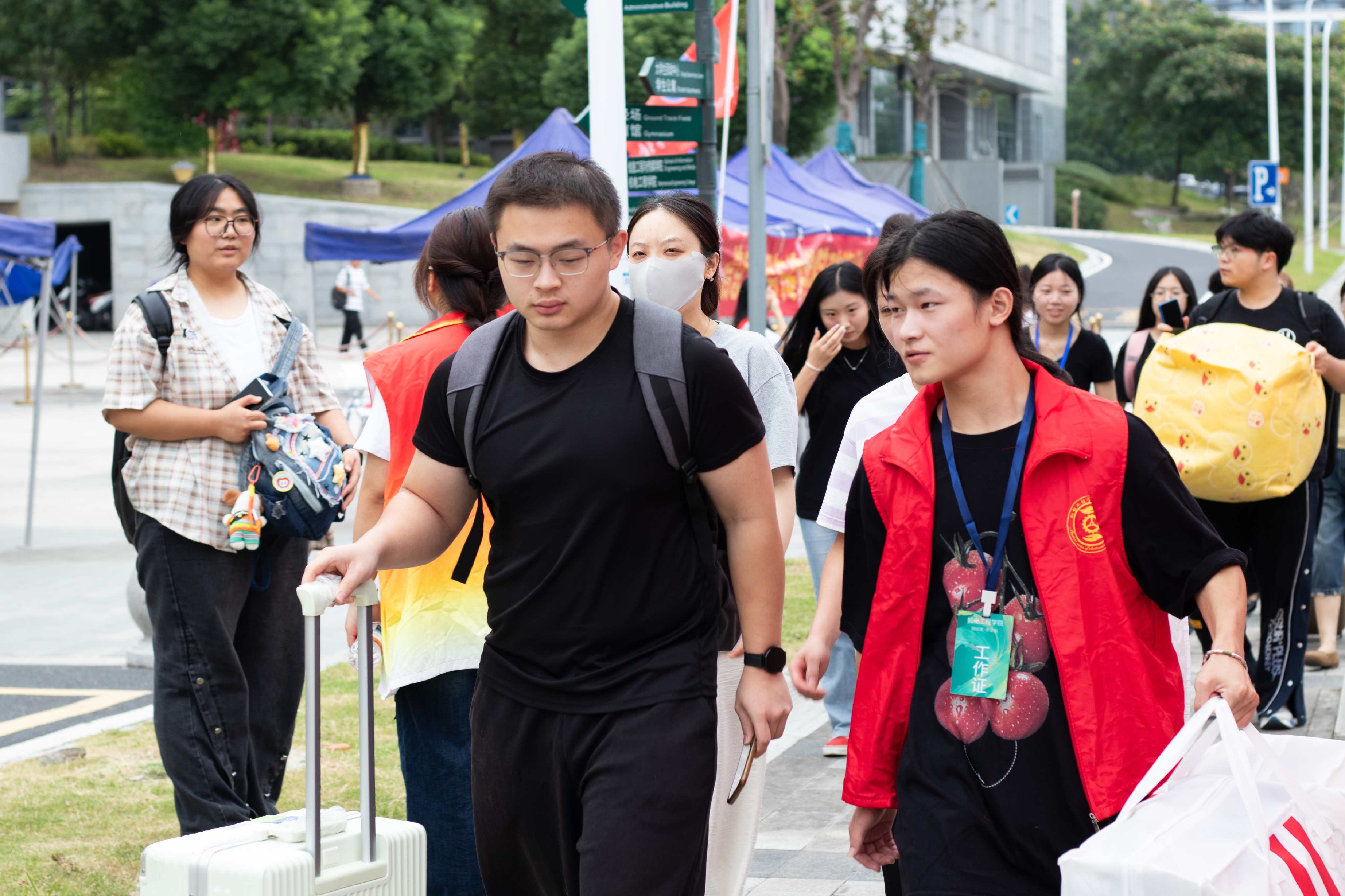 報到當(dāng)天,校園內(nèi)彩旗飄揚(yáng),歡迎橫幅高掛,一派喜慶氣氛。學(xué)院在校內(nèi)主要路口和報到區(qū)域分別設(shè)置了引導(dǎo)志愿者,確保新生“一站式”完成所有入學(xué)手續(xù)。志愿者們身著統(tǒng)一服裝,早早守候在崗位,主動幫助新生搬運(yùn)行李,耐心解答疑問,引導(dǎo)他們辦理各項(xiàng)手續(xù)。不少志愿者還擔(dān)任“一對一”學(xué)長學(xué)姐向?qū)В膛阃律煜ば@環(huán)境,介紹教學(xué)樓、食堂、圖書館等場所,讓初來乍到的同學(xué)迅速融入新環(huán)境。