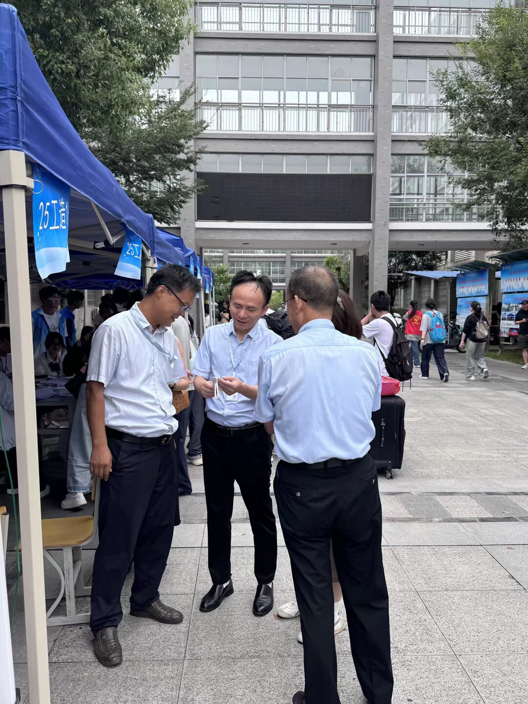 期間,校黨委副書記、校長檀明,校黨委委員、副校長范家茂等領導來到迎新現場,實地查看報到流程、物資保障、環境布置等情況,詳細詢問新生報到人數、志愿服務安排及家長需求等細節。在迎新登記處,校長檀明停下腳步,拿起新生反詐宣傳卡套仔細查看,對該院迎新工作的細致貼心表示充分肯定。隨后,領導們走到新生中間,與來自各地的新生及家長親切交談。“家是哪里的?來學校路上還順利嗎?”“對宿舍環境、專業學習有什么疑問,都可以跟我們說。”