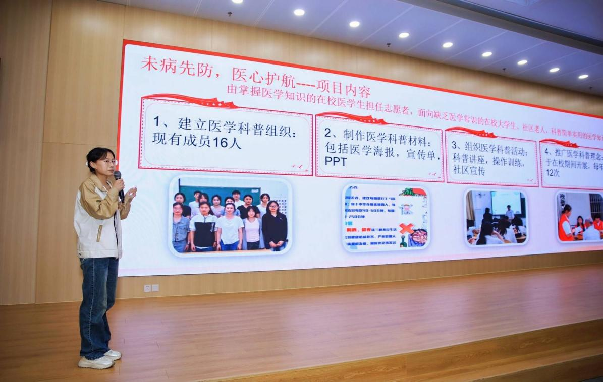 本次大賽匯集了來自全市各行各業的優秀志愿服務項目,競爭異常激烈。比賽現場,項目匯報人沈嘉欣同學以自信飽滿的精神狀態,向評委們清晰闡述了項目的基本內容和亮點所在。該項目緊密結合慢性病高發社會現象,設計了多元化慢性病預防服務方案,充分展現了醫學生的專業素養和創新精神。