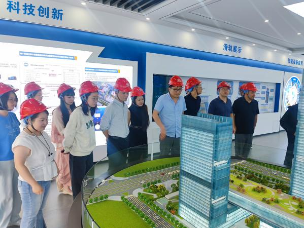 觀摩期間,教師團隊實地參觀智能建造展廳與超高層建筑施工先進工法樣板展示區,與項目技術團隊深入交流。在智能建造展廳內,教師們系統了解智慧工地云平臺的實時數據監測功能,現場體驗AI視頻語音監控及調度系統的智能協同機制,近距離觀摩施工機器人作業流程,并圍繞節能檢測技術應用場景、AR安全體驗系統實操模式展開研討,直觀感受智能建造技術在工程領域的創新實踐成效。