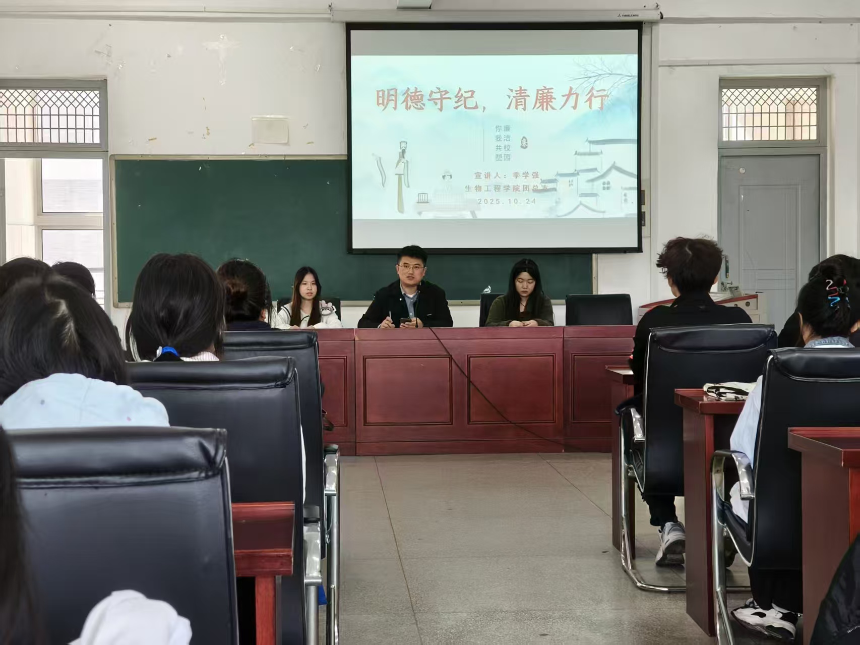 為深入推進廉潔文化建設,增強我校學生的廉潔意識和自律精神,生物工程學院團總支于10月24日在生化樓A305會議室開展了“明德守紀 清廉力行”主題團課。本次團課由該院團總支書記季學強老師主講,所有2025年下半年入團積極分子參加。