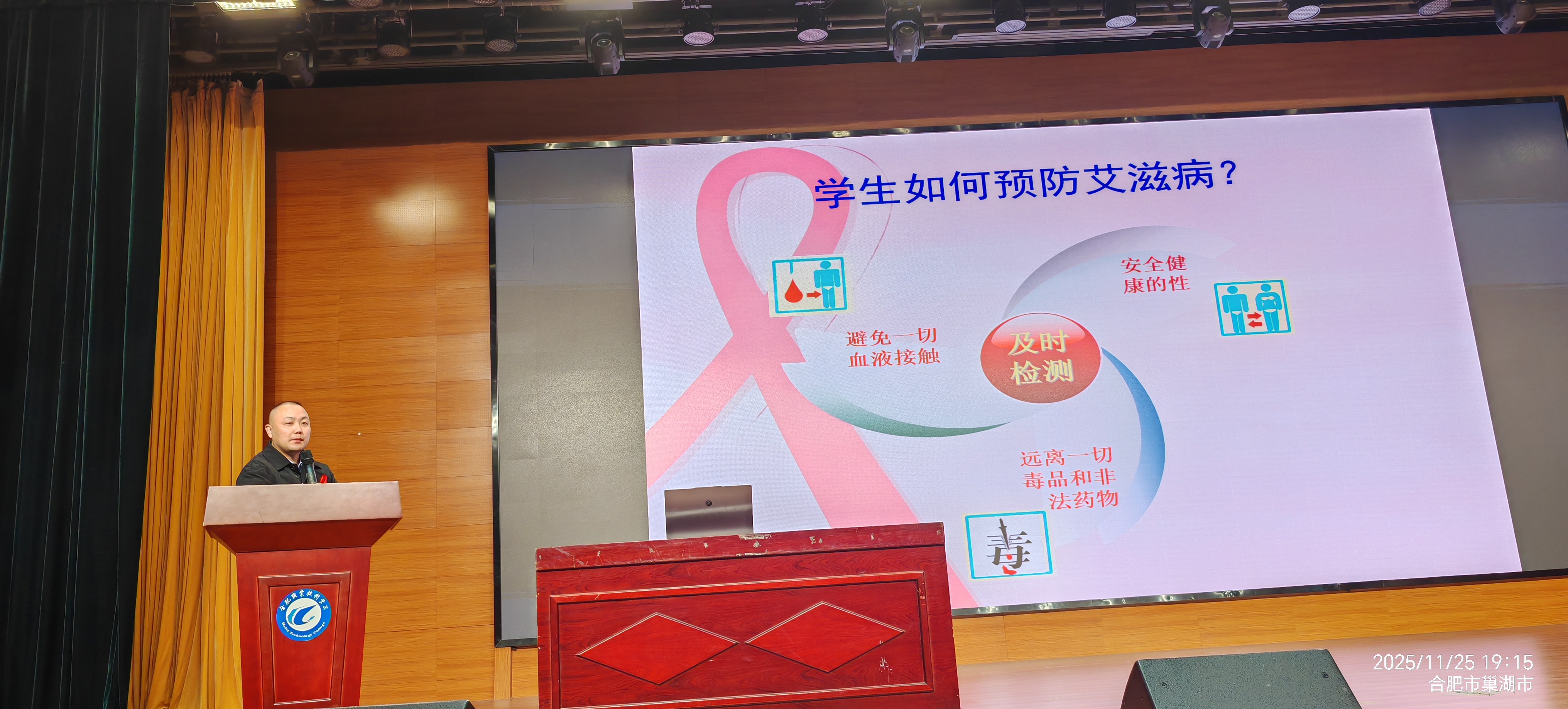 在知識宣講環節,活動特邀巢湖市疾控中心資深巡講員、防艾科專家蘇冬冬主任擔任主講嘉賓。講座環節中,蘇主任以專業嚴謹又通俗易懂的語言,從艾滋病的致病機理、傳播途徑、臨床癥狀等基礎知識點切入,結合典型數據與案例,重點解讀了“血液、母嬰、性接觸” 三大傳播途徑的防控要點,破除了“日常接觸傳染”“病毒不可控” 等常見認知誤區。他特別強調,現代抗反轉錄病毒治療已能將艾滋病轉化為可控慢性病,引導現場觀眾正視艾滋、消除歧視。同時,蘇主任圍繞“控制傳染源、切斷傳播途徑、保護易感人群”三大防控環節,針對性給出了青少年自我保護、高危人群主動檢測等實用建議,強化了“每個人都是自身健康第一責任人”的理念。