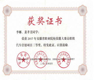 一直以來積極參加市級、院級舉辦的各項活動,不斷提高自己的專業(yè)水平。在合肥市職業(yè)技術(shù)學(xué)院第六屆大學(xué)生職業(yè)規(guī)劃大賽就業(yè)組中榮獲第三名。另外她吃苦耐勞,值得我們每一個人學(xué)習(xí),2017年2月在巢湖亞夏一汽大眾4s店見習(xí)一個禮拜;2016年12月至2017年3月訓(xùn)練安徽省職業(yè)院校高職汽車營銷大賽,擔任銷售顧問的角色。同時作為廣播站的負責人之一對待平時的工作也是十分的認真負責,積極完成站里的各項工作,與共事的同學(xué)認真溝通,共同進步。