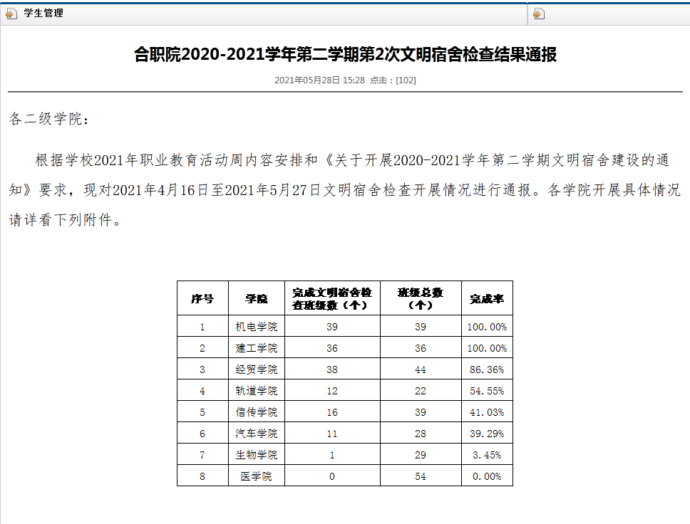 通報建設結果。學生處按照活動內容要求,對文明宿舍建設結果按時通報,利用通報表彰先進,督促后進,促進文明宿舍建設長遠持久、更具實效。