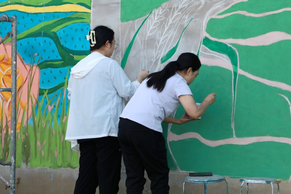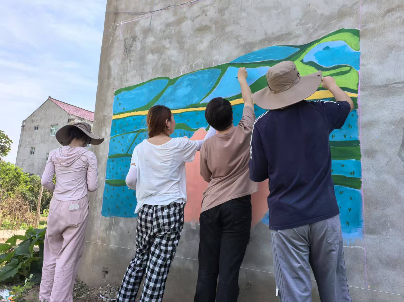 發(fā)揮藝術(shù)設(shè)計(jì)特長(zhǎng),美化村居環(huán)境、賦能文化振興是本次實(shí)踐的另一亮點(diǎn)。實(shí)踐團(tuán)精心策劃,選定樂(lè)土鎮(zhèn)陳營(yíng)村村民文化廣場(chǎng)作為創(chuàng)作基地。緊扣“中國(guó)傳統(tǒng)農(nóng)耕文化”主題,團(tuán)隊(duì)成員們頂著烈日,揮灑汗水,一筆一畫(huà)精心繪制了“春種”“夏長(zhǎng)”“秋收”“冬藏”為主題的四季萬(wàn)物生長(zhǎng)系列墻繪作品。原本單調(diào)的墻面華麗變身,成為傳遞展示鄉(xiāng)土魅力、提升鄉(xiāng)村顏值的亮麗文化景觀,贏得了當(dāng)?shù)馗刹咳罕姷慕豢诜Q贊。