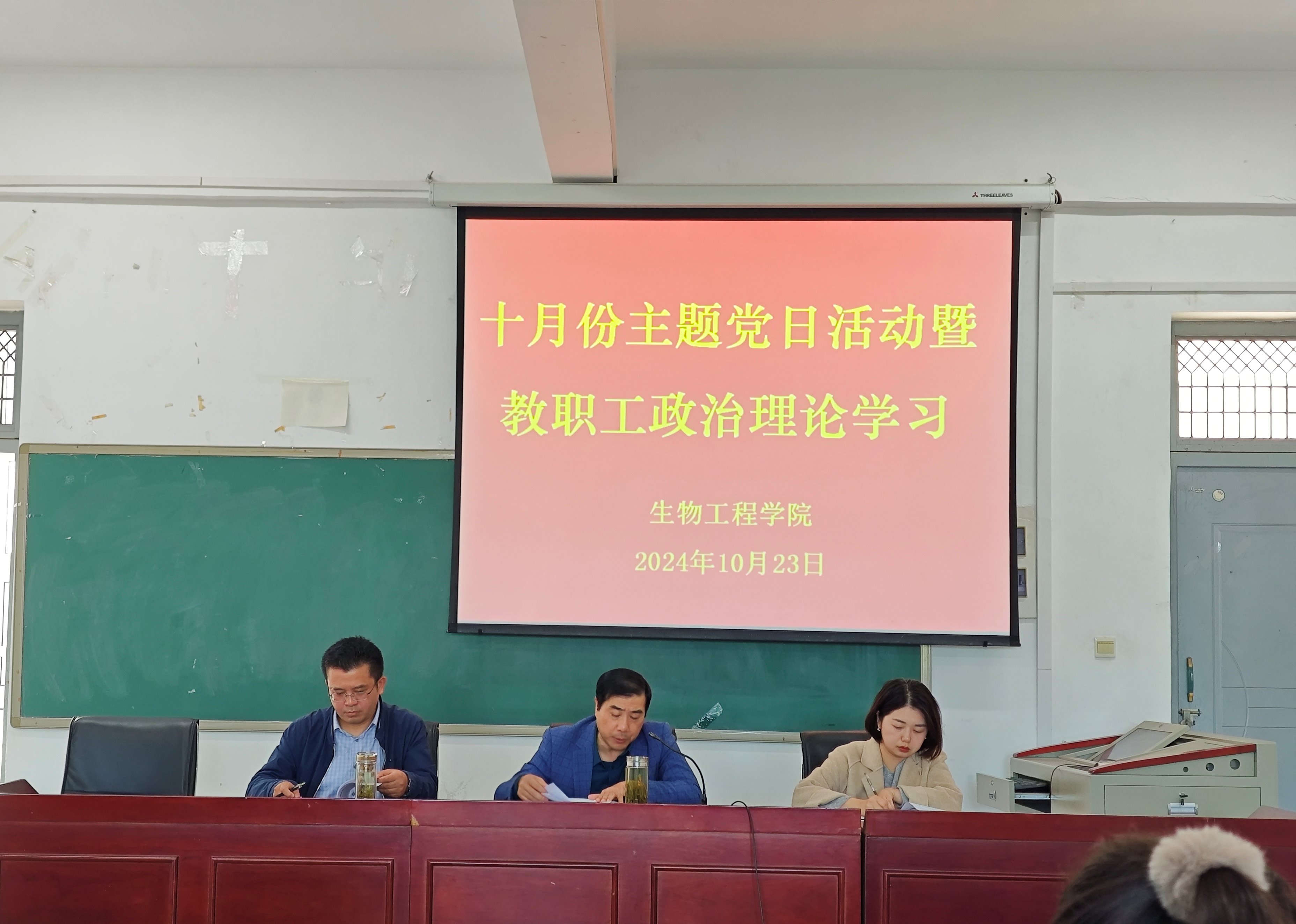 10月23日,生物工程學院在生化樓A305室召開十月份主題黨日集中學習會議暨全體教職工政治理論學習會,會議由該院黨總支副書記(主持工作)慈龍保主持,全體教職工參加會議。