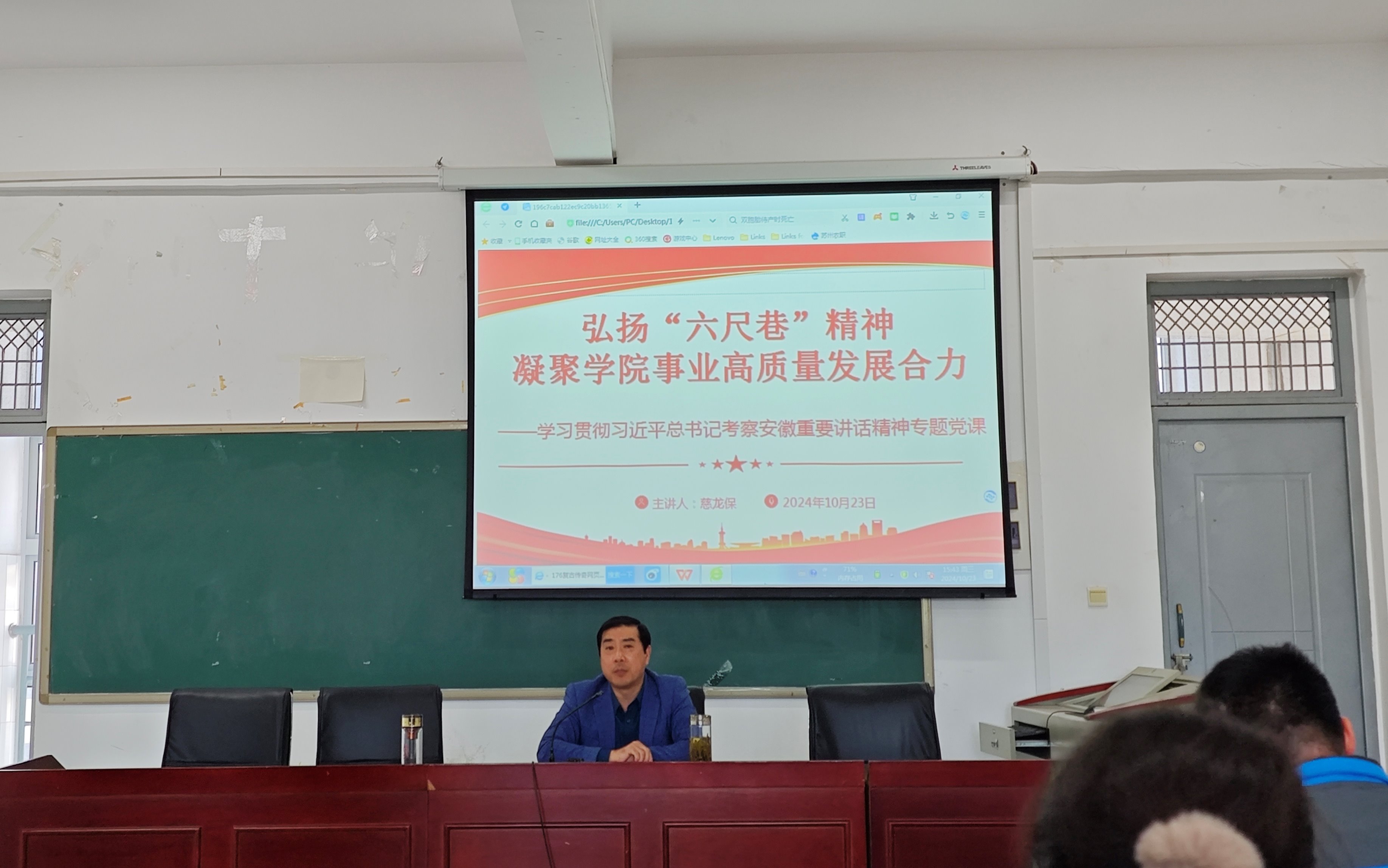會議最后,慈龍保以“弘揚‘六尺巷’精神 凝聚學院事業高質量發展合力”為題開展了學習貫徹習近平總書記考察安徽重要講話精神的專題黨課。他以“六尺巷”的歷史來源及文化內涵為引,結合學院當前工作,就如何弘揚“六尺巷”精神提出四點建議:要加強學習,繼承和弘揚中華優秀傳統文化,通過形式豐富的文化活動以文化人;要培養系統思維、戰略思維,增強大局意識,學會換位思考,加強隊伍建設和團隊協作;要優化管理,提高服務意識和水平,密切聯系師生,解決師生急難愁盼問題,營造和諧的育人環境和工作氛圍,凝聚學院事業高質量發展最強合力,為早日實現學校發展目標作出積極的更大的貢獻?。ü└澹荷锕こ虒W院 鄭丹 初審:慈龍保 審核:楊璨)