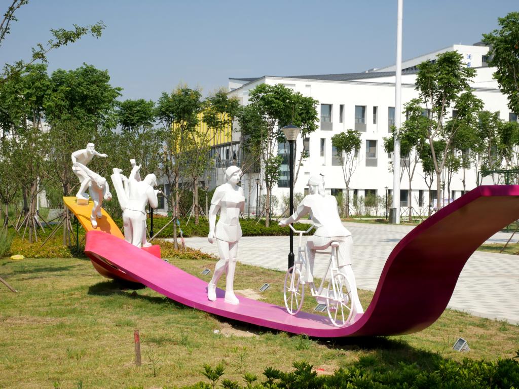 本雕塑以舞動青春為主題,以自行車、滑輪、街舞為設計元素,采用剪紙鋼板和網格的形式來體現大學生活的青春活力。造型輕盈,簡單時尚,色彩豐富,動感十足。設置在校園的運動區,使作品與環境相得益彰,生動有趣。