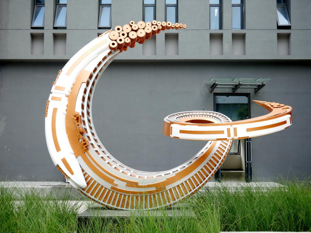 雕塑以縱橫交錯的軌道為造型載體,將飛馳的列車與車輪等交通元素融入其中,表達出“阡陌交通、縱橫四海”的文化主題,同時作品表面采用不銹鋼本色和黃銅色交織,既體現出時代感也強化了專業性。作品整體造型豐富而富有動感,給人以穿越和延伸的遐想。作品靈動的空間造型為規整的院落平添了幾分活力與激情。