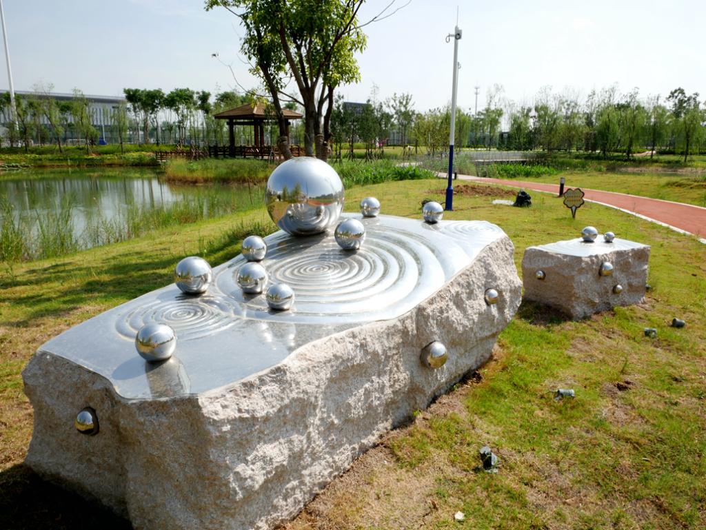 作品將不銹鋼鍛造成波瀾的水面與石頭巧妙結合,點點飛珠水濺,寓意知識的積累猶如雨滴匯聚成河,匯入大海。暗示學子兼收并蓄、博觀約取,厚積薄發、掛帆滄海。