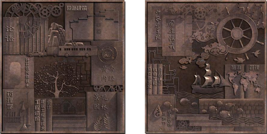 設置在學校圖書館東門,浮雕以求實創新為線索,將學校的專業和發展方向有機結合,以學校的專業符號與學習的場景和文字為元素展開設計。其間的河流貫穿始終,寓意求實是源、創新是本,以此鼓舞學生要奮發圖強,開拓創新。