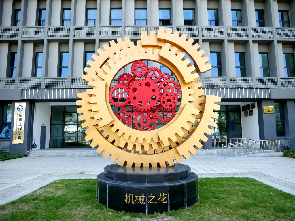 雕塑位于機電工程學院入口處,以機械原件典型代表齒輪為創作元素進行有機結合,以向日葵為設計表達對象。以此象征機電工程學院開足馬力向著明天的輝煌不斷開拓與進取。同時富有很強的標識性和趣味性,為整個校園風光添光加彩。