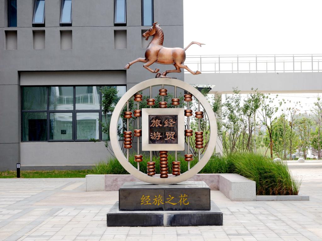 雕塑以經貿旅游學院為表現對象,將古銅幣、算盤、印章與中國旅游行業標志“馬踏飛燕”等文化元素有機結合,造型生動、明快。作品在材質上運用不銹鋼與紫銅相結合,使作品在現代手法中詮釋出傳統文化的獨特魅力。