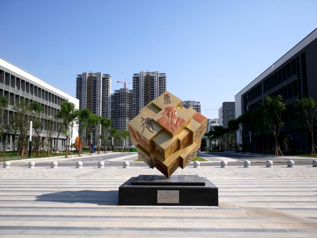 雕塑采用技藝“魔方”為造型載體,將傳統技術名人魯班、畢升等人物,四大發明和學校的校訓“崇德、重技、求實、創新”有機結合,在空間上不斷呼應和變化,從而傳遞出時代的變遷、技術的延續、傳承的永恒等信息。